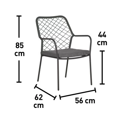 Das Stahl-Gestell punktet durch besondere Stabilität und Unverwüstlichkeit. Es lässt sich gut reinigen und ist witterungsbeständig. Die Armlehnen sind zwar schmal, bieten aber durch ihre Rundung eine bequeme Auflagefläche. Ein großes Sitzkissen sorgt für eine weiche Unterlage. Es ist anthrazitfarben und harmoniert mit dem Gestell. Mit einer Dicke von 3,5 cm erhöht das Kissen Ihren Sitz-Komfort. Bei einer Höhe von 85 cm beträgt die Breite 62 cm. Seine Tiefe liegt bei 56 cm.